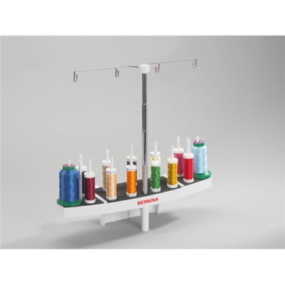 Le multisupport de bobines permet un accès et un changement de fil rapides, ce qui facilite notamment la couture des motifs de broderie multicolores. En outre, la distance à l’aiguille est plus longue grâce au support de bobine télescopique ; ainsi, les fils difficiles seront désenchevêtrés avant la couture.