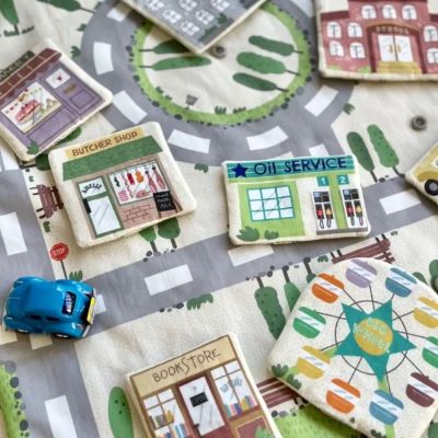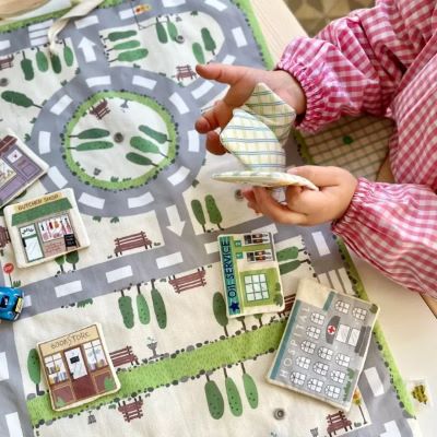 Avec le panneau “Ma ville”, vous pourrez créer un tapis de jeu représentant une petite ville avec ses bâtiments, des magasins mobiles et 5 parkings pour jouer avec leurs voitures préférées. C’est un jeu amusant et éducatif. Et lorsque le temps de jeu est terminé, le panneau peut être suspendu pour ajouter une touche décorative à la chambre des enfants, ou roulé pour le ranger ou l’emporter partout avec vous