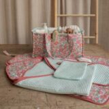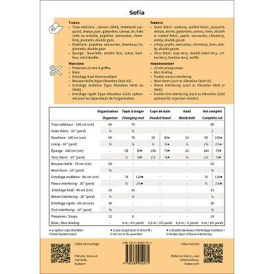 Sofia est un ensemble de 4 patrons pensés autour de l’univers du bain et du change de bébé : un tapis à langer nomade, une cape de bain, un gant de toilette et un organisateur. Des options oreilles sont proposées pour la cape de bain et le gant de toilette. L’organisateur transportable comporte des séparateurs amovibles pour y ranger des couches, produits d’hygiène, vêtements, jouets… Le tapis à langer comporte des poches et une serviette détachable pour un lavage facile. Les finitions sont soignées (coutures anglaises et gansées) pour un résultat raffiné.