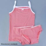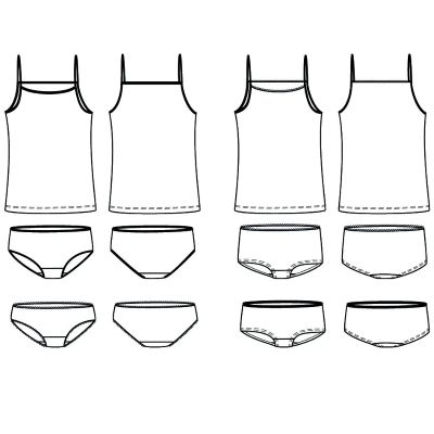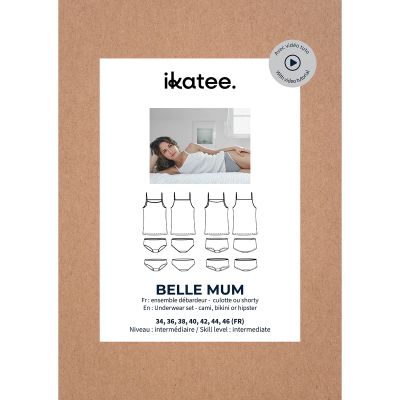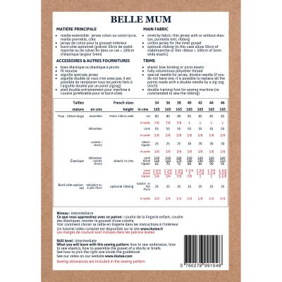 Belle mum est un patron de sous-vêtement pour femme dans lequel on retrouve un débardeur à fines bretelles, une culotte et un shorty disponible en taille haute ou basse. Différentes finitions sont possibles : biais élastique, bord-côte ou élastique à picot.